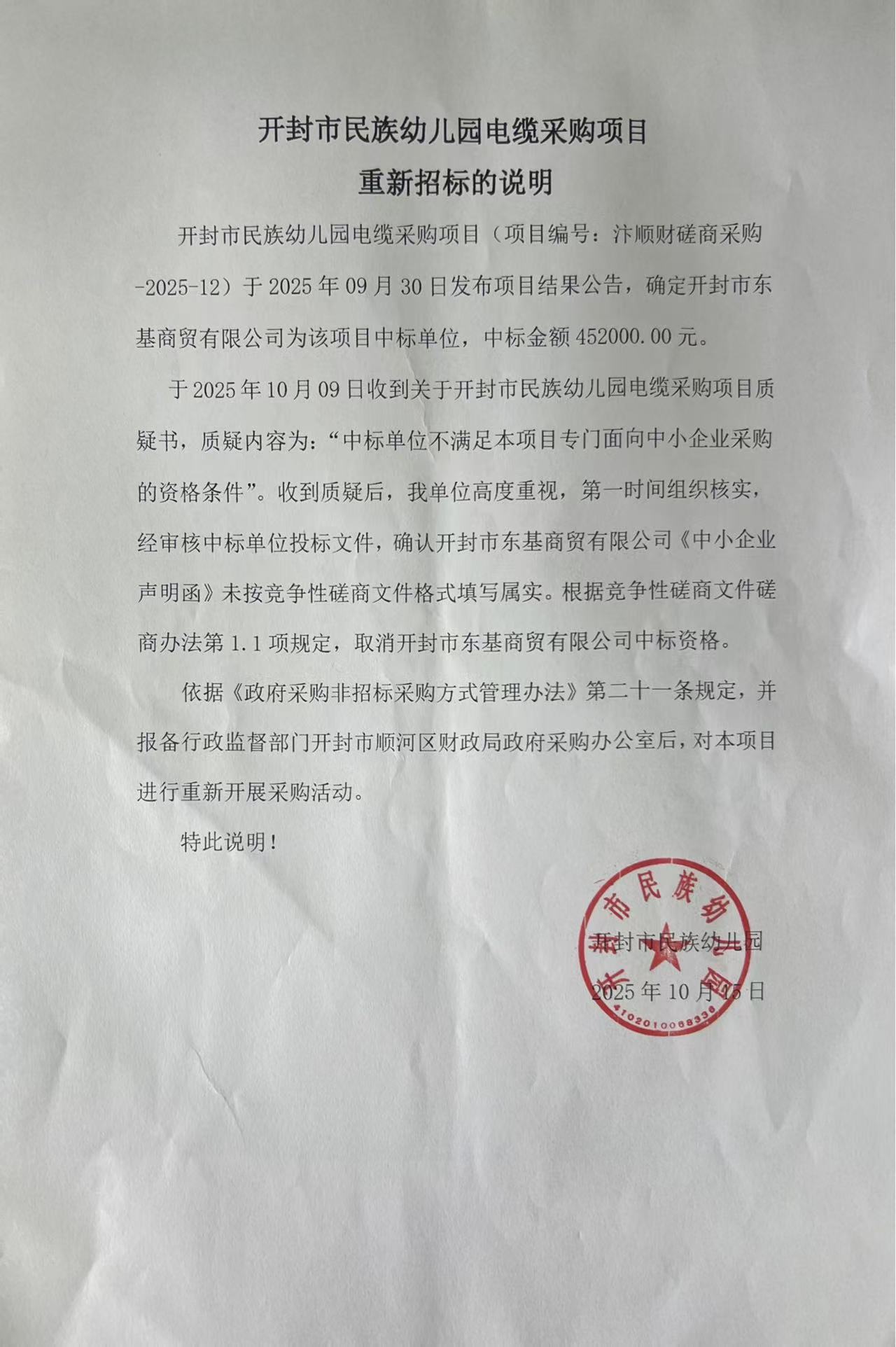 于2025年10月09日收到关于开封市民族幼儿园电缆采购项目质疑书,质疑内容为:“中标单位不满足本项目专门面向中小企业采购的资格条件”。收到质疑后,我单位高度重视,第一时间组织核实,经审核中标单位投标文件,确认开封市东基商贸有限公司《中小企业声明函》未按竞争性磋商文件格式填写属实。根据竞争性磋商文件磋商办法第1.1项规定,取消开封市东基商贸有限公司中标资格。