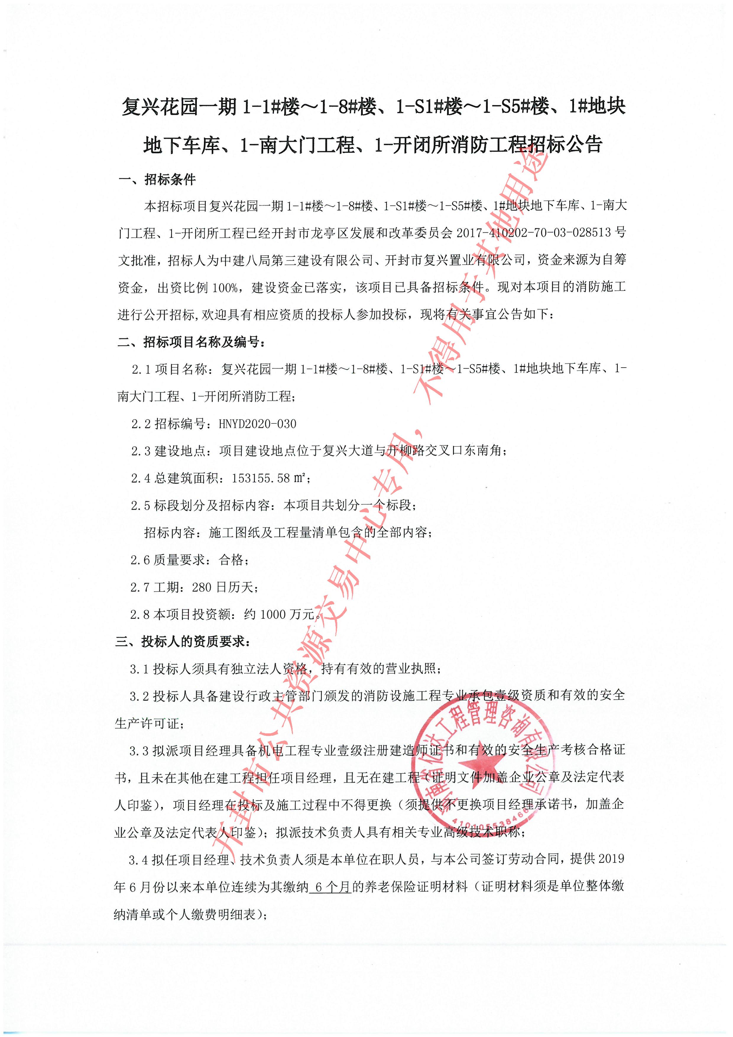复兴花园一期1-1#楼~1-8#楼、1-S1#楼~1-S5#楼、1#地块地下车库、1-南大门工程、1-开闭所消防工程招标公告